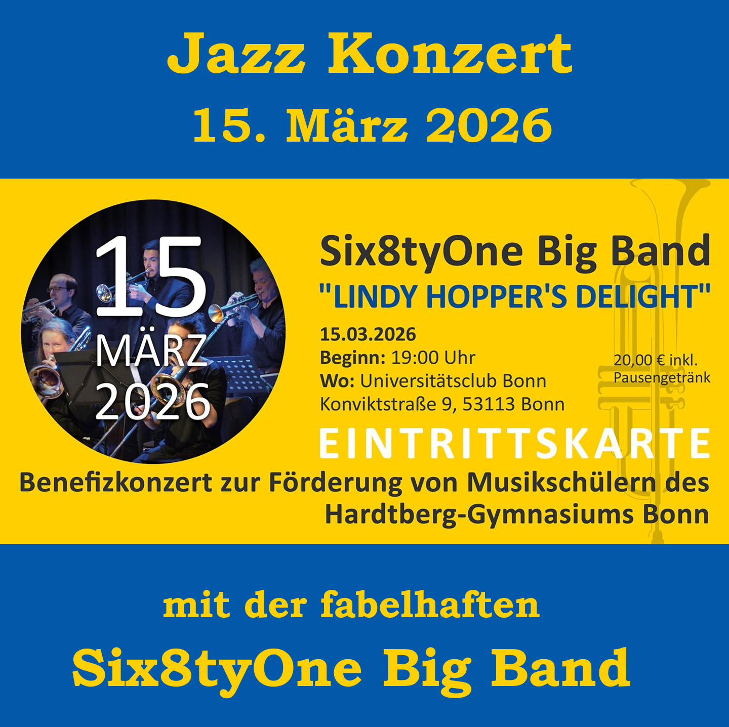 Zum 6. Mal nun spielt die Six8tyOne Big Band mit dem neuen Motto “Lindy Hopper´s Delight” am 15. März 2026 zu Gunsten musikbegabter Schüler des Hardtberg-Gymnasiums, Bonn, im schönen Ambiente des Universitätsclubs in Bonn.